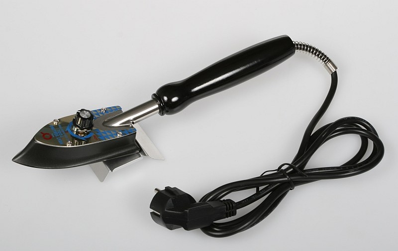 Modelářská potahovací žehlička s teflonem potaženým tělem a regulací teploty s bimetalovým páskem.
