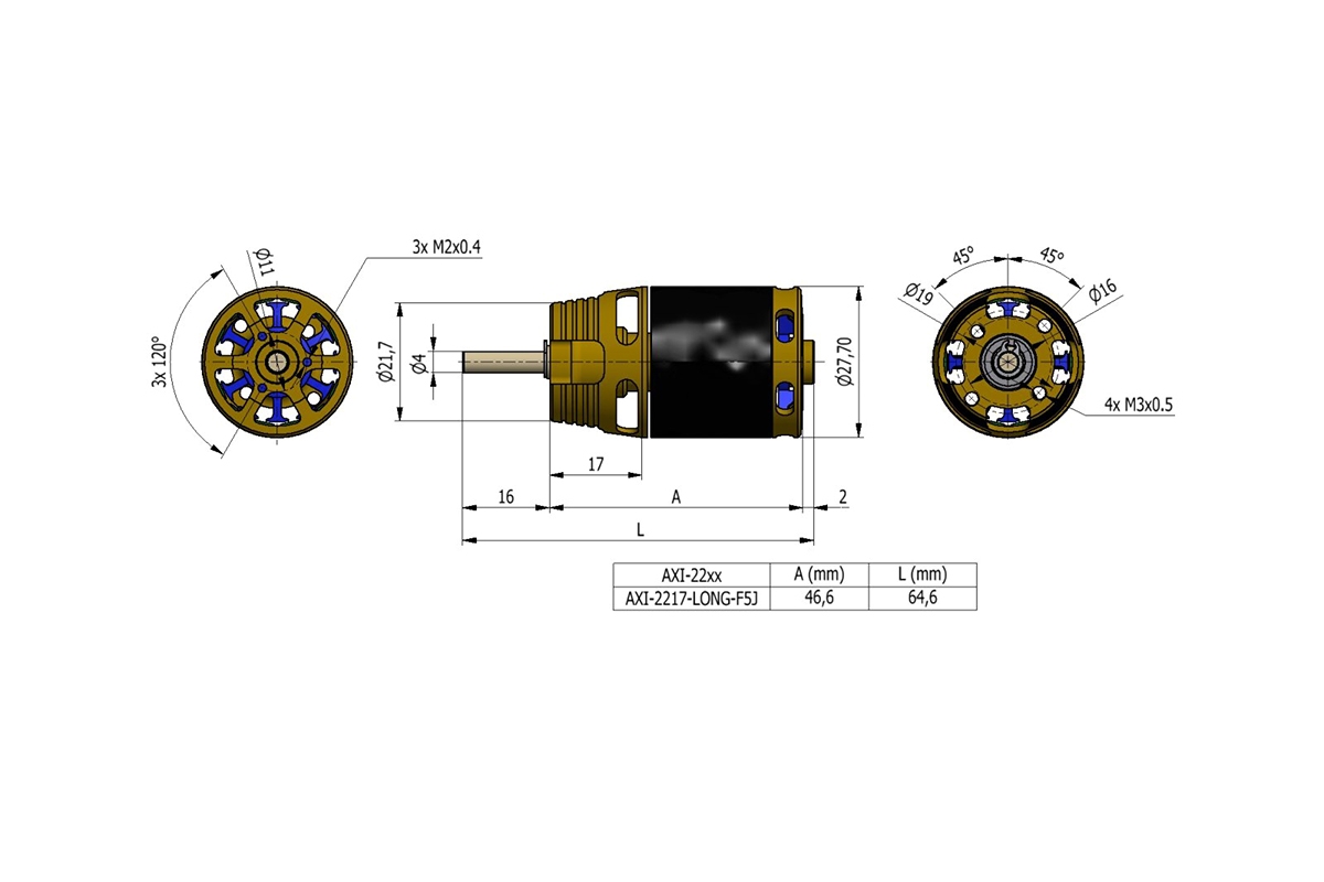 AXI 2217/12 V2 Long je střídavý motor učený pro pohon menších modelů s letovou hmotností do 1000 g s napájením z dvoučlánkového nebo tříčlánkového akumulátoru Li-poly. Výborně se hodí pro menší hotlinery, kde lépe funguje vrtule menšího průměru s vyšším počtem otáček.