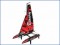 RC set obsahuje: hotový model plachetnice s černými trupy a červeno-černou plachtou s osazenou palubní elektronikou, dvoukanálový vysílač 2,4GHz, stojánek a návod k obsluze.