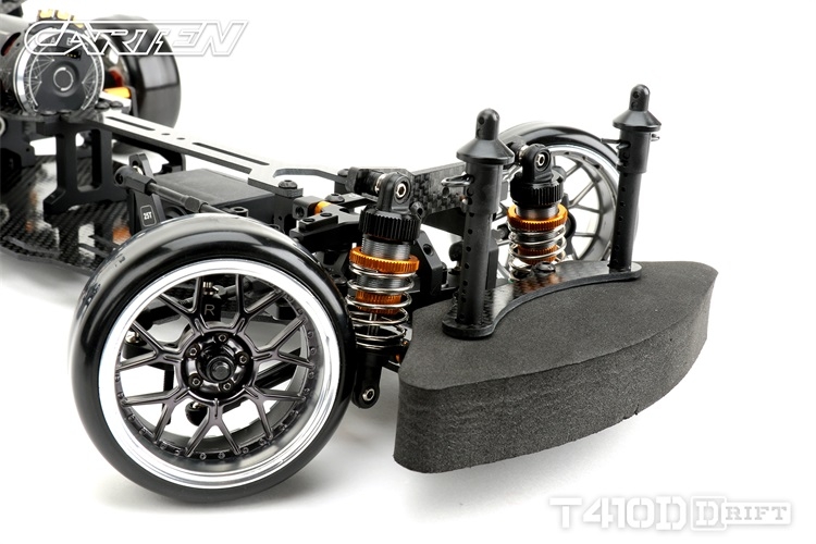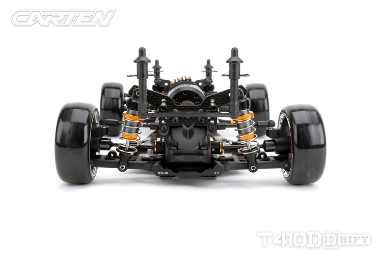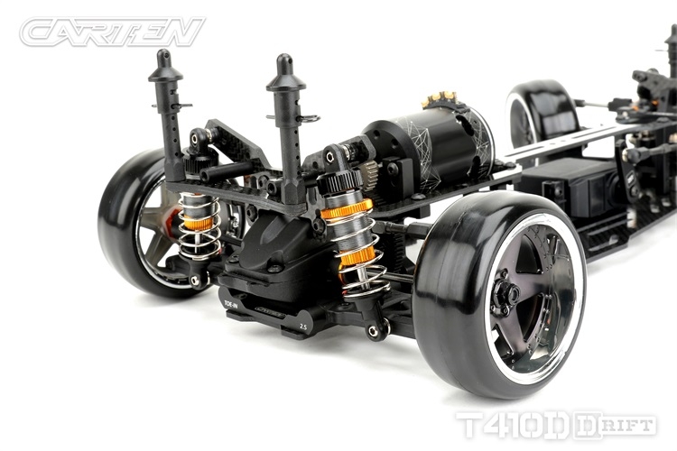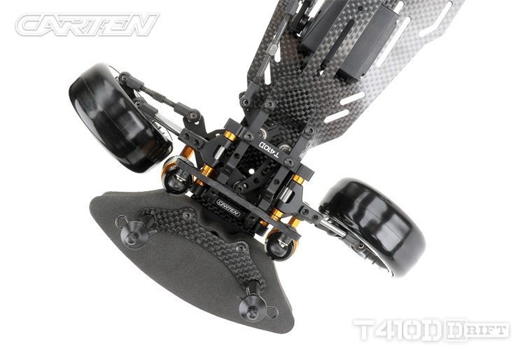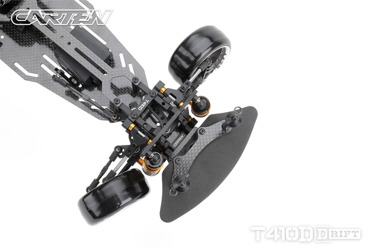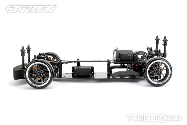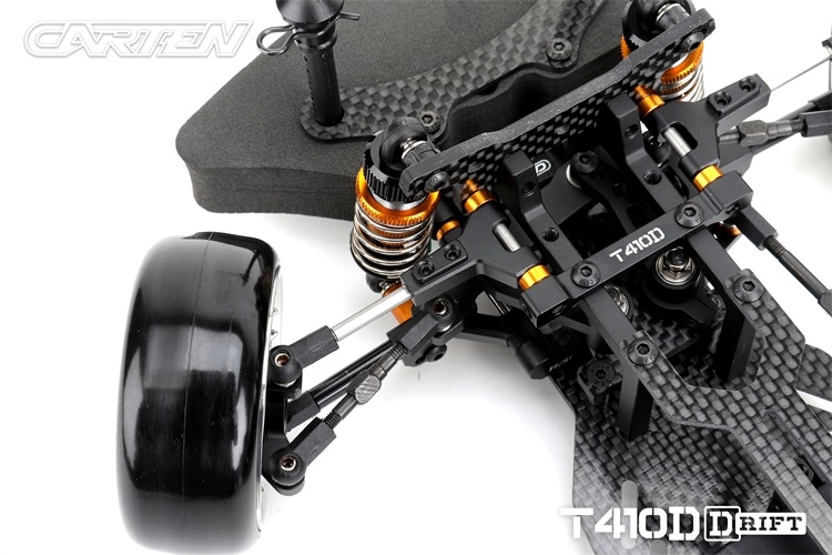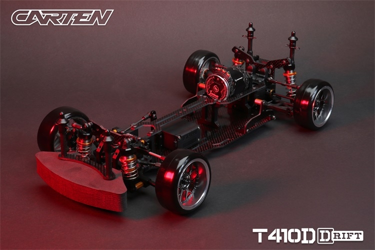 Stavebnice podvozku pro rekreační i soutěžní 1/10 RC drift. Carten T410D přináší kvalitní komponenty z karbonu a hliníku. Moderní layout zahrnuje podélné horní uložení motoru a držák akumulátoru v blízkosti zadní nápravy. Výsledkem je optimální těžiště a zatížení zadní nápravy optimální i pro závodní použití. Požadavkům náročných řidičů vyhoví i vysoký maximální úhel řízení a široké možnosti nastavení geometrie.