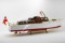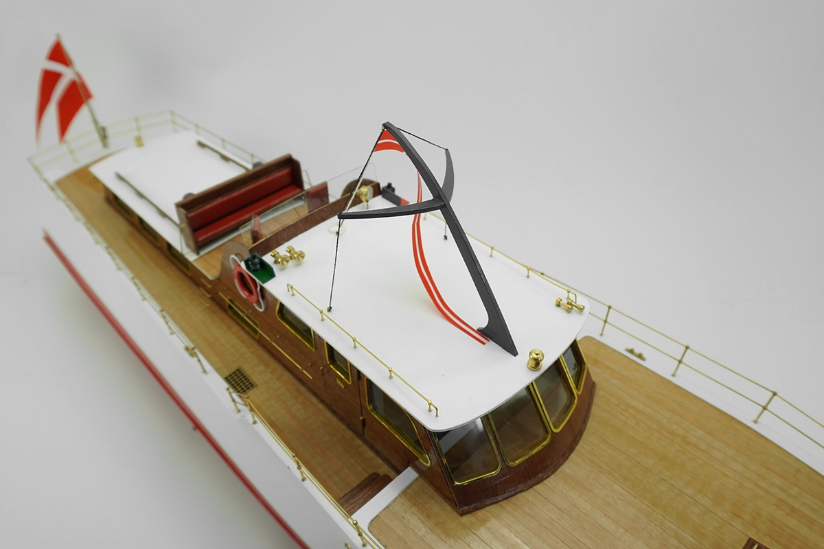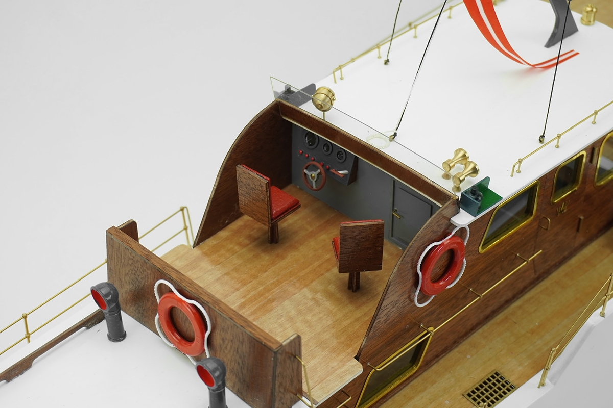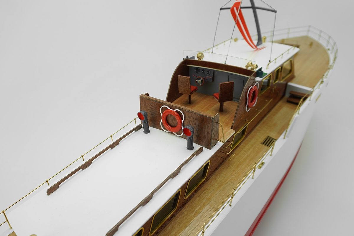 Maketa luxusní motorové jachty z padesátých či šedesátých let dvacátého století. Lodi tohoto typu sloužily pro zábavu/přepravu movitých majitelů, hollywoodských hvězd a jiné smetánky. Tomu také odpovídalo hojné použití mahagonu a teaku v konstrukci lodi, chromovaných kovových částí, luxusně polstrovaných kožených sedaček a jiného nóbl příslušenství.