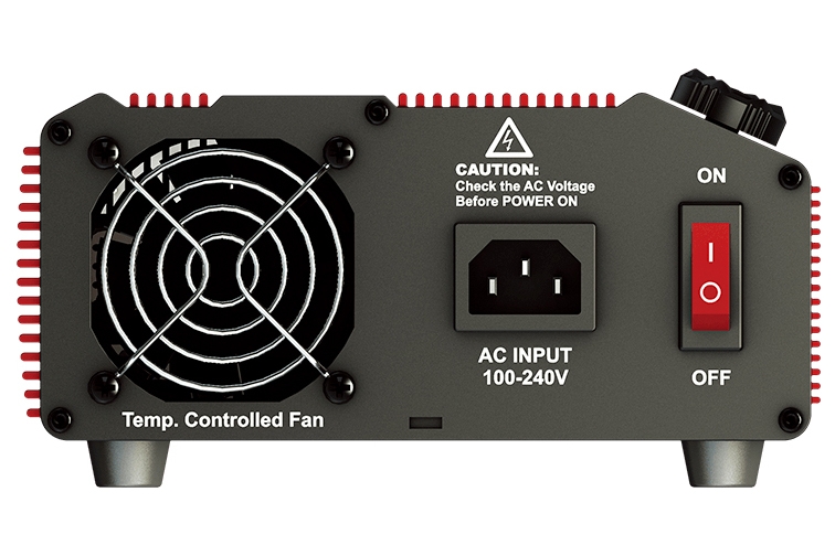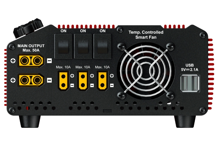 Hlavní výstup zdroje 15-30 V/50 A (max. 1200 W) je opatřen robustními šroubovacími zdířkami pro standardní 4 mm banánky. Navíc jsou k dispozici 3 paralelní zásuvky pro 4 mm banánky opatřené vypínači. Napětí výstupu je nastavitelné pomocí knoflíku na předním panelu, napětí a proud na výstupu jsou zobrazovány na LCD displeji.
