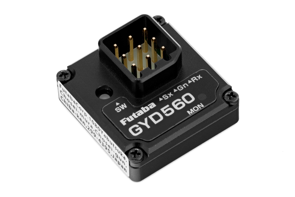 GYD560 je lehké programovatelné dvourežimové mikro gyro s integrovaným MEMS senzorem speciálně vyvinuté pro ovládání a stabilizaci řízení driftovacích modelů aut s možností dálkového řízení zisku a přepínání provozních režimů s pomocí vysílače. Disponuje možnostmi nastavování řady parametrů s pomocí tlačítka a LED na gyru nebo přímo v menu kompatibilních vysílačů Futaba (T10PX s nejnovější verzí firmwaru) a je vybaveno vstupním S.BUS/S.BUS2 portem. Činnost gyra je signalizována LED indikátorem.
