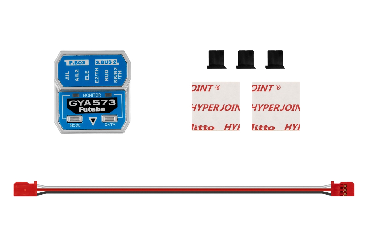 GYA573 je lehký programovatelný 6-osý stabilizační systém (integrovaný 3-osý MEMS gyroskopický senzor + 3-osý akcelerometr) pro ovládání a stabilizaci modelů letadel poháněných spalovacím motorem i elektromotorem s možností dálkového řízení zisku ve 3 osách a přepínání provozních režimů s pomocí vysílače. Umožňuje nastavování řady parametrů s pomocí tlačítek a LED na gyru, s pomocí programátoru GPB-1 (s nejnovější verzí firmwaru) nebo s pomocí kompatibilního vysílače Futaba (T16IZ Super, T26SZ, T32MZ s nejnovější verzí firmwaru). K přijímači se připojuje prostřednictvím S.BUS2 portu; kromě PWM výstupů pro klasická serva nabízí i výstupní S.BUS port s až 26 kanály. GYA573 podporuje křidélka, výškovku nebo směrovku ovládané dvojicí serv a nabízí mixy pro samokřídla a motýlkové ocasní plochy. Činnost gyra je signalizována LED indikátorem.