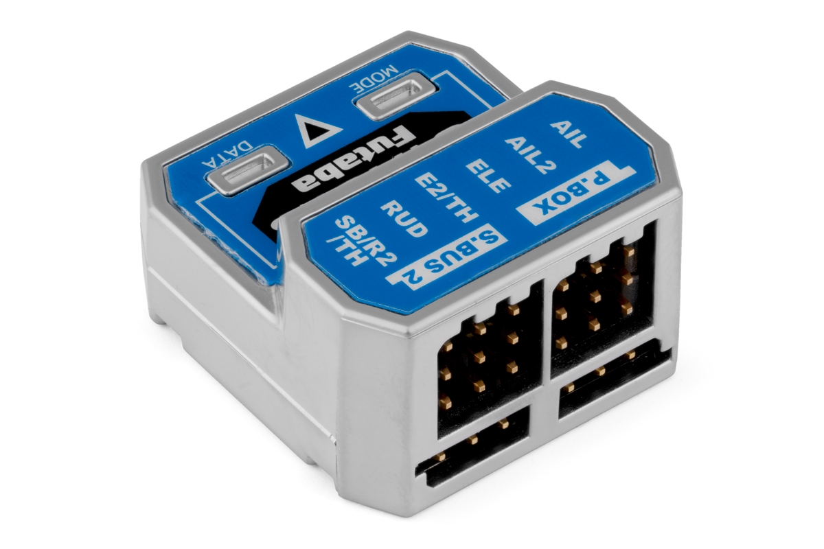 - Funkce portu SB/R2 – Volí funkci zásuvky SB/R2; buď PWM signálový výstup pro klasické servo Směrovky 2, nebo S.BUS výstup s až 18 kanály (dle RC soupravy).
