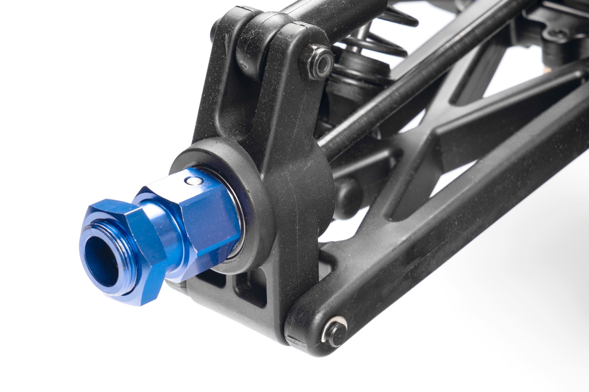 Veškeré spojovací tyče (svorníky ramen apod.) jsou ocelové o průměru 7mm vybavené pravo-levým závitem a šestihranem, což umožňuje pohodlné a přesné nastavení geometrie podvozku. O odpružení se stará čtveřice celokovových olejových tlumičů s vinutými pružinami. Předpětí pružiny je jednoduše nastavitelné pomocí matice s jemným závitem. Modře eloxované držáky tlumičů (parohy) jsou vyrobeny z 8mm silného!!! duralu. Ráfky kol jsou vybaveny šroubovaným límcem, který zajišťuje pneumatiku bez nutnosti lepení. Nízkoprofilové pneumatiky mají osvědčený "buggynový" vzorek a mají průměr 178mm. Bezpečně zastavit tento model to už chce sílu a proto je použita dvojitá kotoučová brzda.