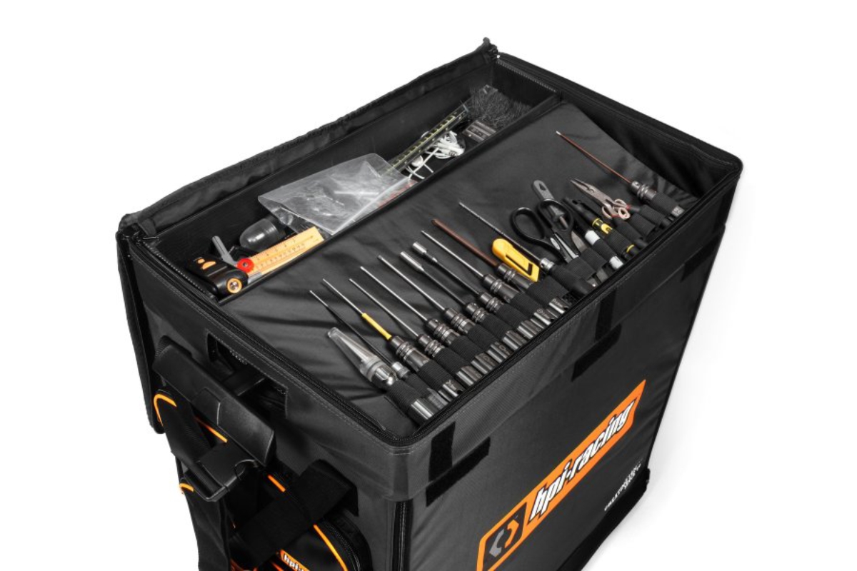 Horní polička na zip je vybavena držáky na nářadí, ale vejde se do ní snadno i organizér na nářadí. Je zde spousta dalšího prostoru pro velké nářadí, velký ručník do depa a mnoho dalšího! Výběr bočních kapes zahrnuje obrovskou boční kapsu, do které se vejde mimořádně velká nastavovací deska, koncovou kapsu na návody k použití nebo časopisy a dvě kapsy na opačném konci, do kterých se vejdou čisticí spreje a oleje na diferenciály nebo tlumiče.