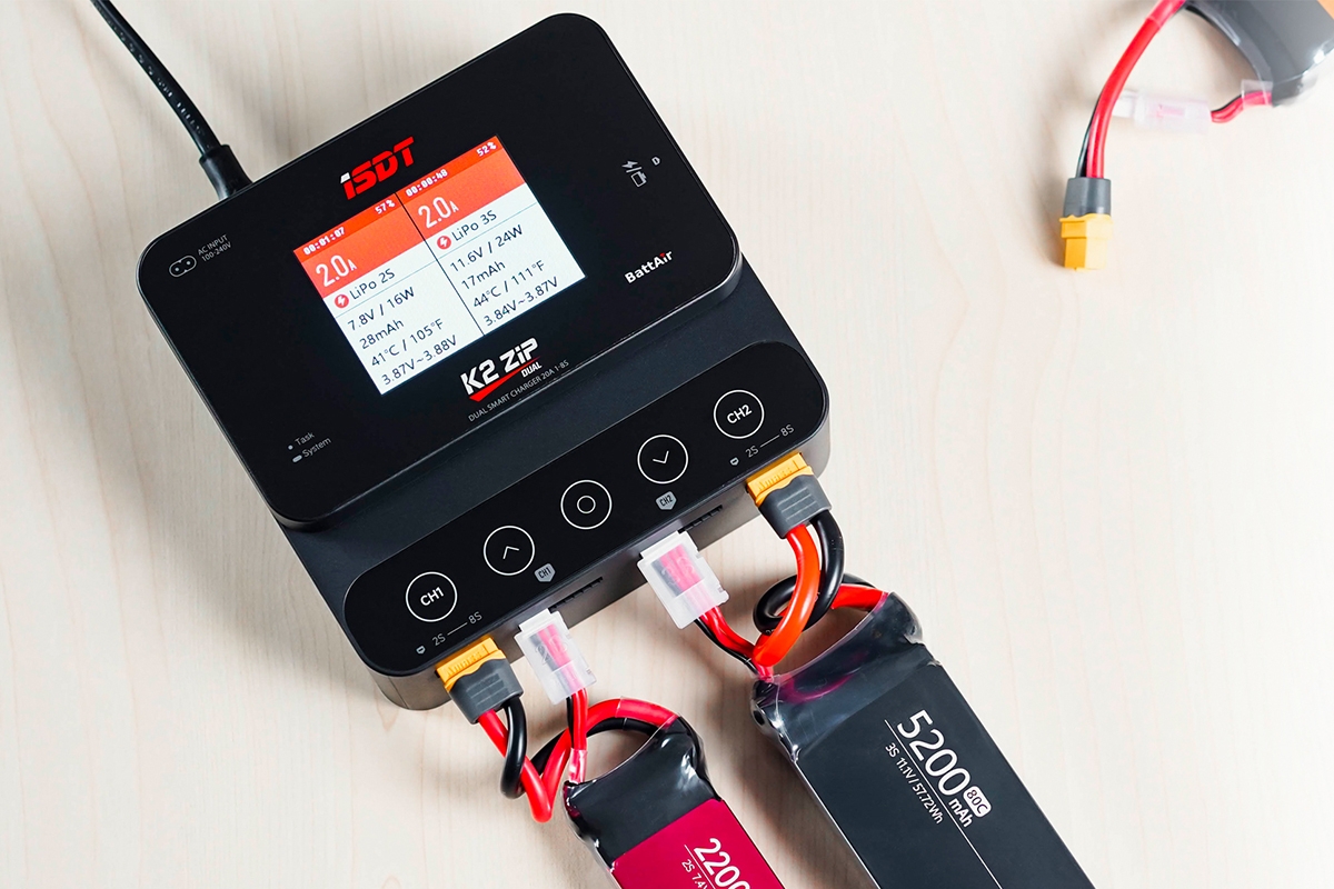 Vysokovýkonný dvoukanálový nabíječ ISDT K2 ZIP 2x500W je inteligentní nabíječ s napájením ze sítě i autobaterie a velmi jednoduchou a přehlednou obsluhou. K2 ZIP umožňuje nabíjet a vybíjet běžné typy článků (NiCd, NiMH, LiPo, LiHV, ULiHV, Li-ion, LiFe, Pb), navíc je vybaven vestavěnými osmikanálovými balancery, které zajišťují bezpečné nabíjení lithiových akumulátorů. Nabíječ je vybaven barevným LCD displejem a programovacími tlačítky, které vám poskytnou možnost komfortního a velice přehledného nastavování parametrů, řízení a sledování průběhu nabíjení/vybíjení.