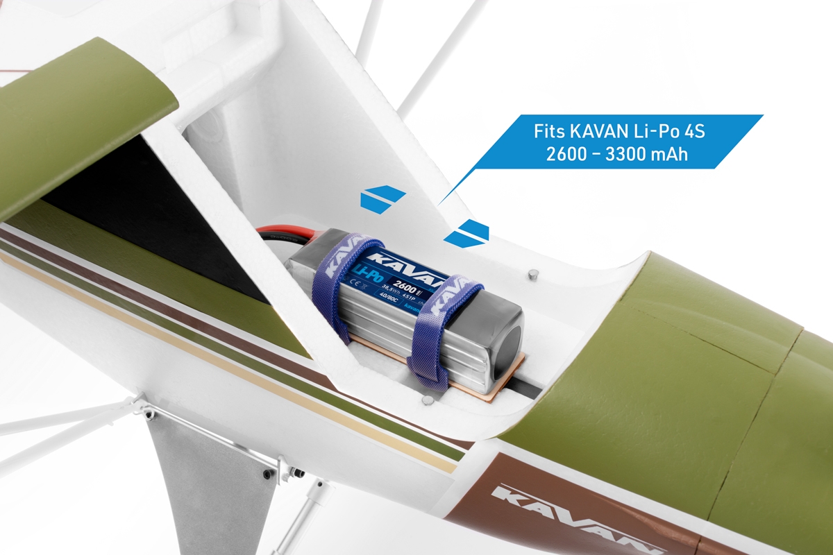 Pro napájení budete potřebovat LiPo čtyřčlánek s kapacitou 2600–3300 mAh se zatížitelností aspoň 30C. Konkrétní typ volte tak, aby vám bez dalšího dovažování co nejlépe vycházela správná poloha těžiště.