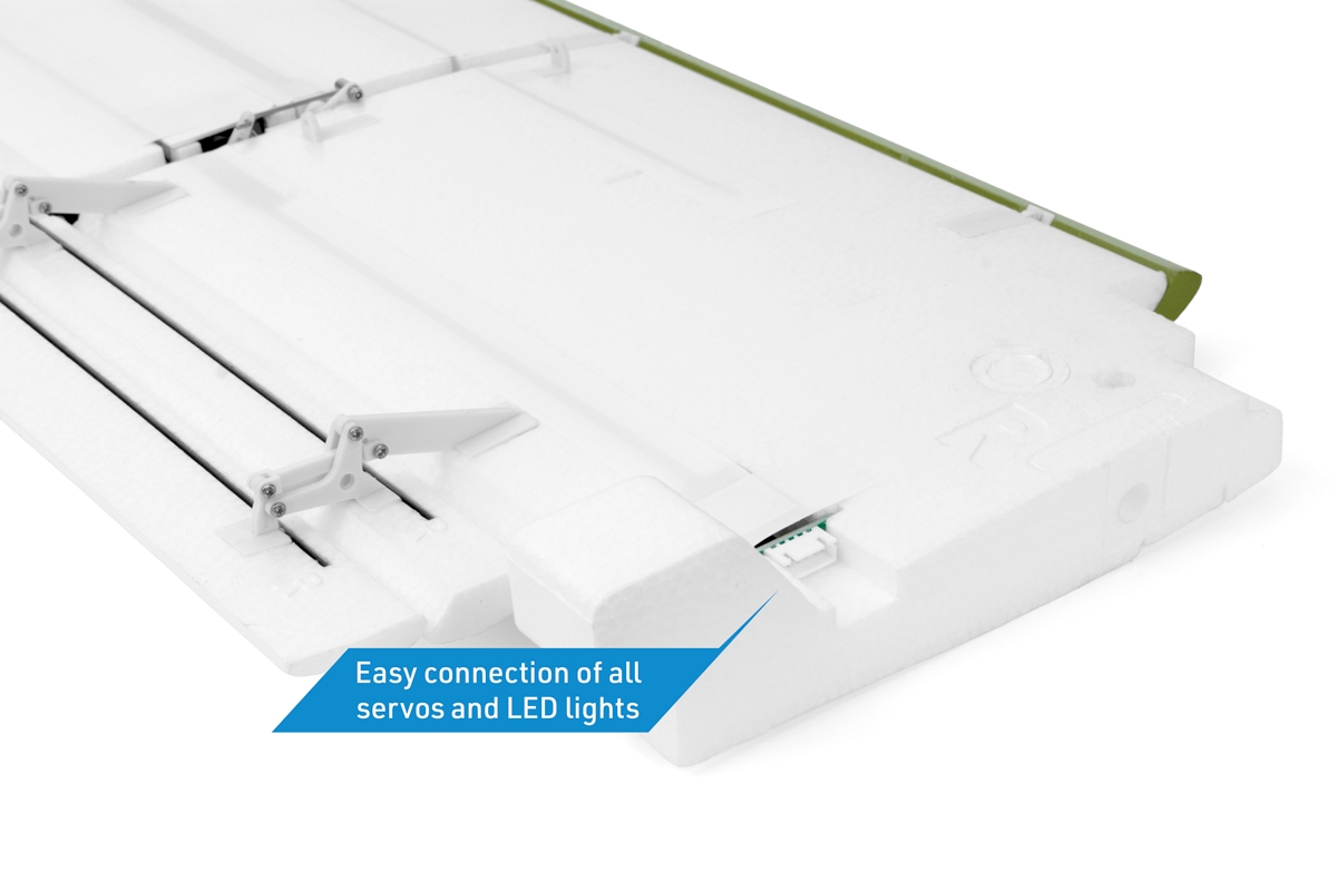 Křídlo modelu z pěnového EPO je dvojdílné s uhlíkovými nosníky a uhlíkovou trubkovou spojkou. Na místě je zajištěno šrouby. Křidélka i dvouštěrbinové Fowlerovy klapky (se spřaženými sloty na náběžné hraně) jsou ovládány nezávisle vždy dvěma servy s krátkými přímými drátovými táhly a nechybí ani funkční poziční LED světla. Snadno demontovatelné uhlíkové vzpěry křídla jsou zajištěny na místě páry drátových sponek.