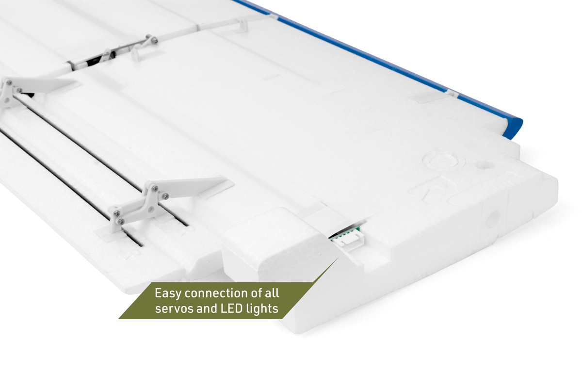 Křídlo modelu z pěnového EPO je dvojdílné s uhlíkovými nosníky a uhlíkovou trubkovou spojkou. Na místě je zajištěno šrouby. Křidélka i dvouštěrbinové Fowlerovy klapky (se spřaženými sloty na náběžné hraně) jsou ovládány nezávisle vždy dvěma servy s krátkými přímými drátovými táhly a nechybí ani funkční poziční LED světla. Snadno demontovatelné uhlíkové vzpěry křídla jsou zajištěny na místě páry drátových sponek.