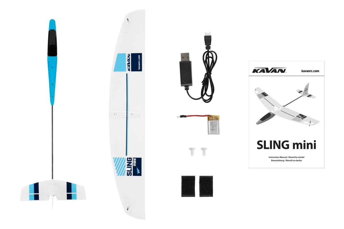 ARF set obsahuje: hotový model SLING Mini, přijímačový LiPo akumulátor, USB nabíječ a návod.
