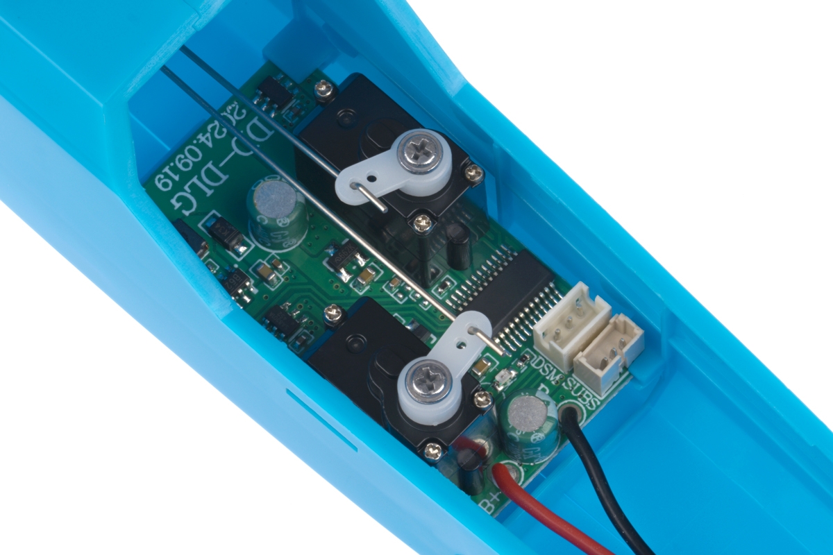 Pro ovládání modelu budete potřebovat nejméně čtyřkanálovou RC soupravu s miniaturním přijímačem (schopným pracovat s napájením z 1S LiPo akumulátoru), který je vybaven sériovým S.BUS nebo DSM2 výstupem. Přijímač prostě připojíte do odpovídajícího vstupu na desce elektroniky v modelu - přiřazení kanálů dekodéru je pevné: výškovka je kanál 2, směrovka kanál 4.