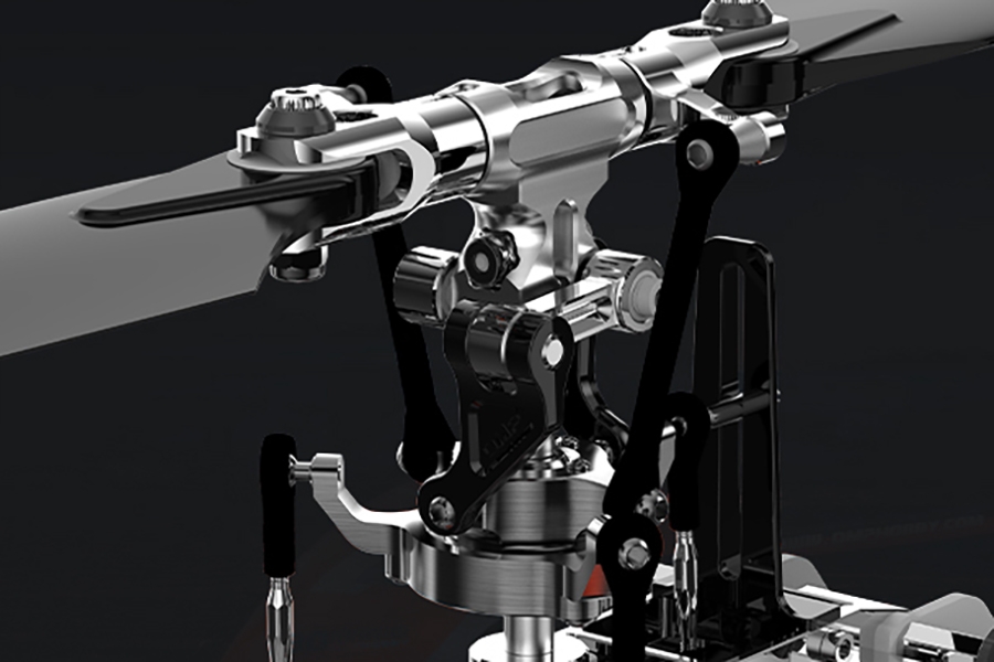 Robustní 4 mm hlavní hřídel je uložena v kuličkových ložiscích. Deska cykliky je duralová stejně jako rotorová hlava s unašeči listů. Díky 3G flybarless systému a elektronickému CCPM je rotorová hlava s optimalizovanou geometrií velmi jednoduchá. Unašeče listů nosného rotoru jsou nádhernou miniaturou unašečů „velkých" RC vrtulníků - se všemi těmi kuličkovými ložisky a tlumícími vložkami!