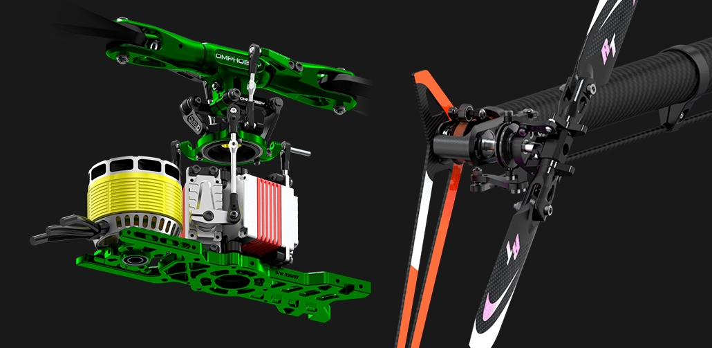• Celokovová rotorová hlava z vysokopevnostního duralu 7075 s velkým rozsahem výchylek pro vynikající odezvu a autoritu řízení