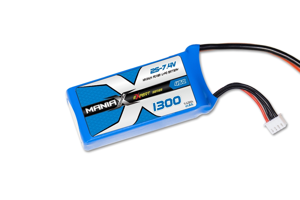 LiPo akumulátorová sada ManiaX se zatížitelností 45/90C, nabíjení 1-3C, max. 5C. Dvoučlánek 2S 7,4V 1300 mAh, rozměry: 75x34x15mm, hmotnost: 80g, XT60 + servisní konektor JST-XH.