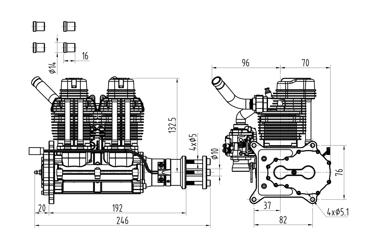 Letecký benzinový čtyřtaktní dvouválcový motor s objemem 60ccm a výkonem 5,1 koně (3,8kw) při 8 000ot/min. Doporučený provoz na N95 v poměru 35:1 s plně syntetickým 2T olejem.