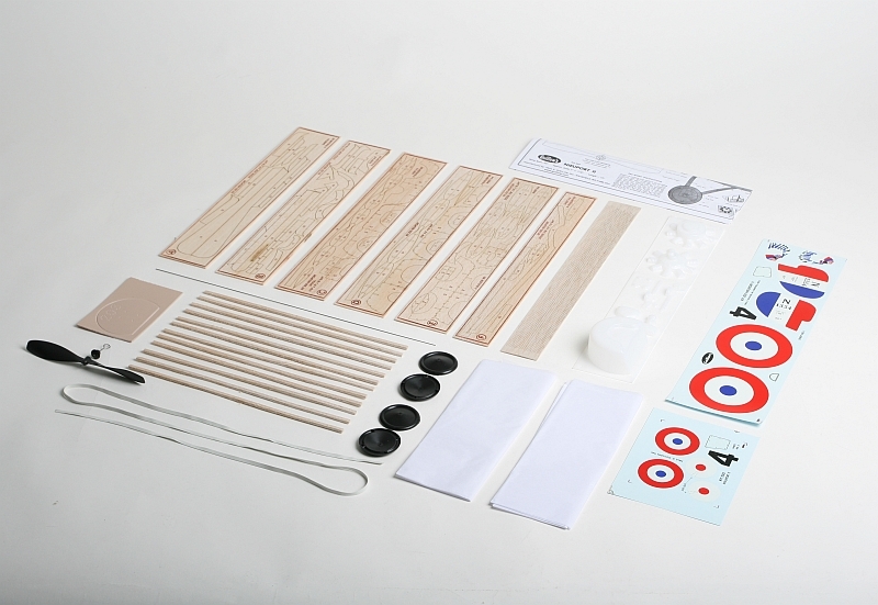 Stavebnice obsahuje: balsové laserem vyřezávané díly, balsové nosníky, předseknuté díly z plastikové překližky, vakuově lisované maketové díly (kryt motoru, maketa motoru, kulomet...), plastovou vrtuli s hřídelí a hlavicí, gumový svazek (guma 5x1mm), plastová kola, ocelovou strunu na podvozek a další drobné díly, plastová kola, potahový papír, aršík mokrých obtisků, stavební plán.