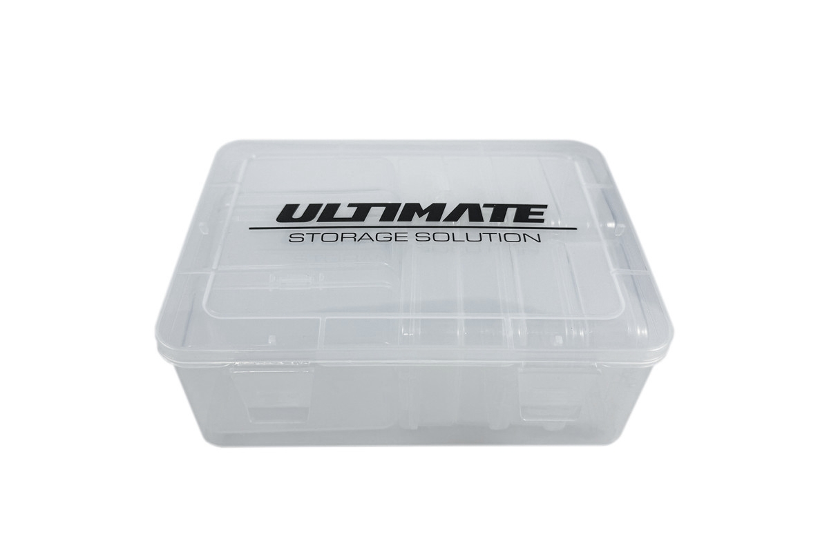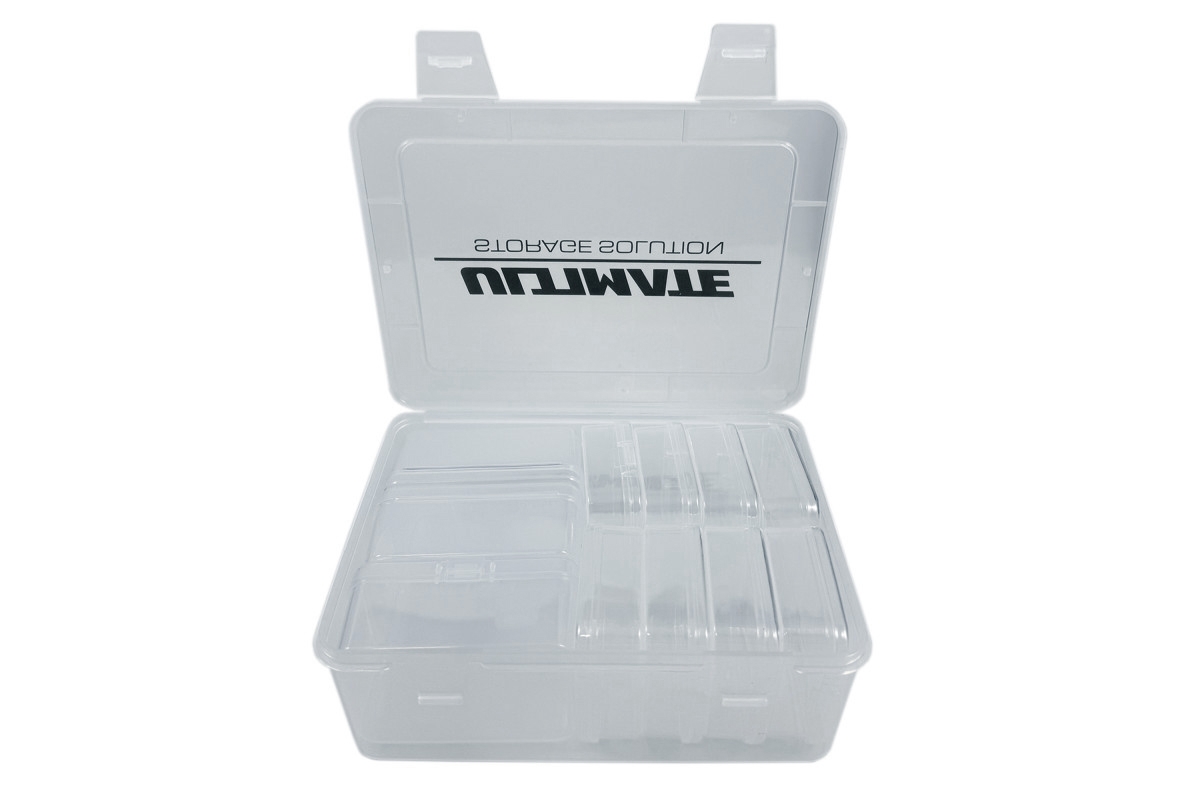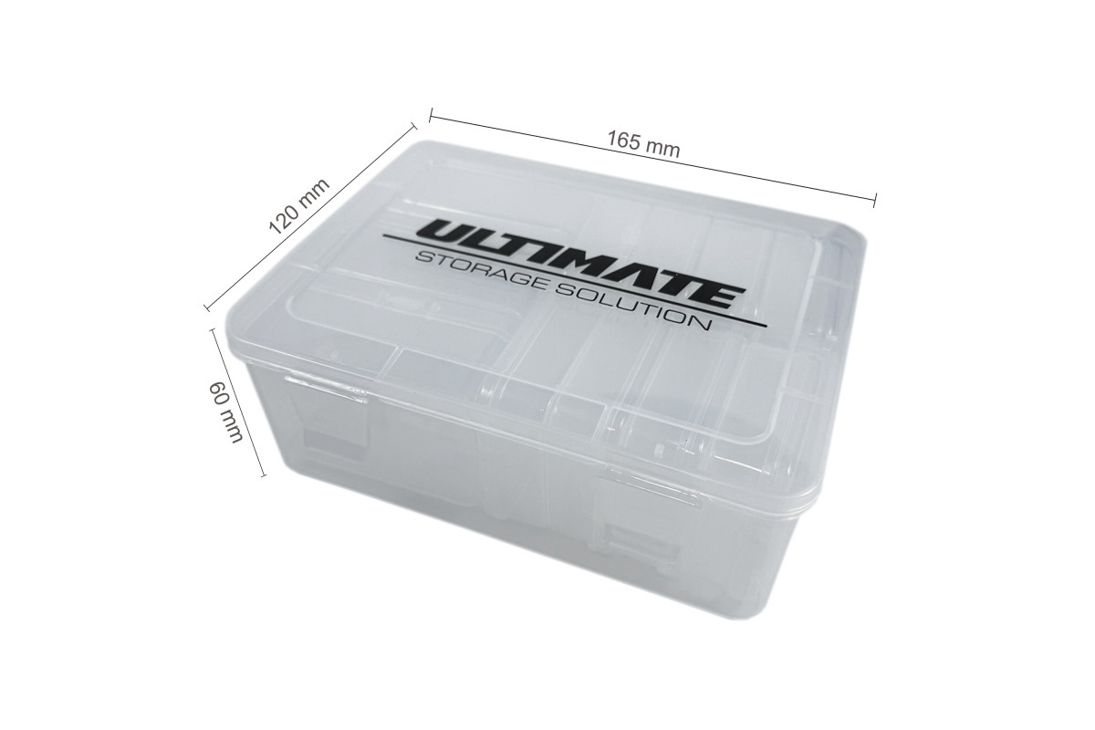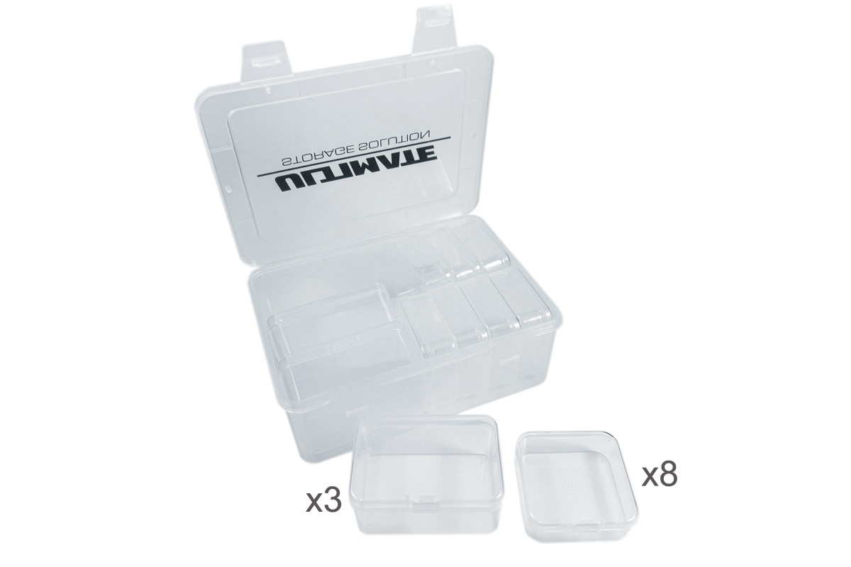 Pevný, odolný, průsvitný box o rozměrech 165x120x60 mm obsahuje 3 vnitřní boxy o rozměrech 75x50x35 mm a 8 boxů o rozměrech 55x55x20 mm se samostatným zaklapávacím víkem pro rychlé a snadné uložení dílů.