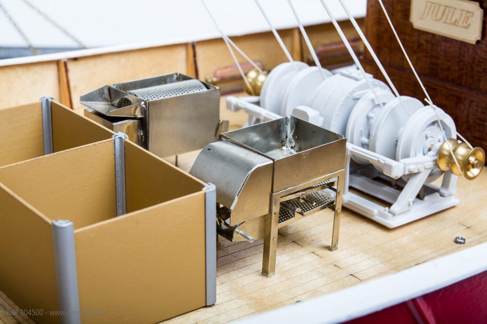 Všechny laserem řezané překližkové díly potřebné pro stavbu, mahagonové díly i disky, Depronhelling, kování, lodní hřídel, kormidlo a stojan. Kormidelna je zcela postavena. Komplexní sada leptaných dílů z niklového stříbra, která je rovněž součástí stavebnice, obsahuje světlomety, vibrační síto, vařič, třídicí systém a mnoho dalšího. Rozsáhlá sada kování z litých kovových dílů ještě více umocňuje bohaté vybavení. Model lze vybavit mnoha dalšími speciálními funkcemi. Pro rozšíření o světelné funkce doporučujeme světelný modul EasyLight (obj. č. AERO701903). Video Jule v akci můžete najít na YouTube.