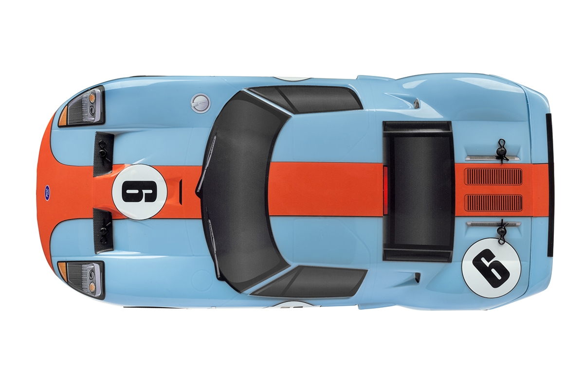 typický vzhled závoďáku Ford GT40, který dominoval okruh Le Mans v letech 1966–1969, včetně legendárního 1-2-3 finiše v roce 1966. RC model od značky HPI je