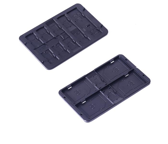 Pouzdro na 4 ks SD karet, 10 ks micro SD karet, 1 ks SIM a 1 ks micro SIM karty. Rozměry pouzdra jsou 87 mm x 25 mm x 7 mm, váha 17 g.