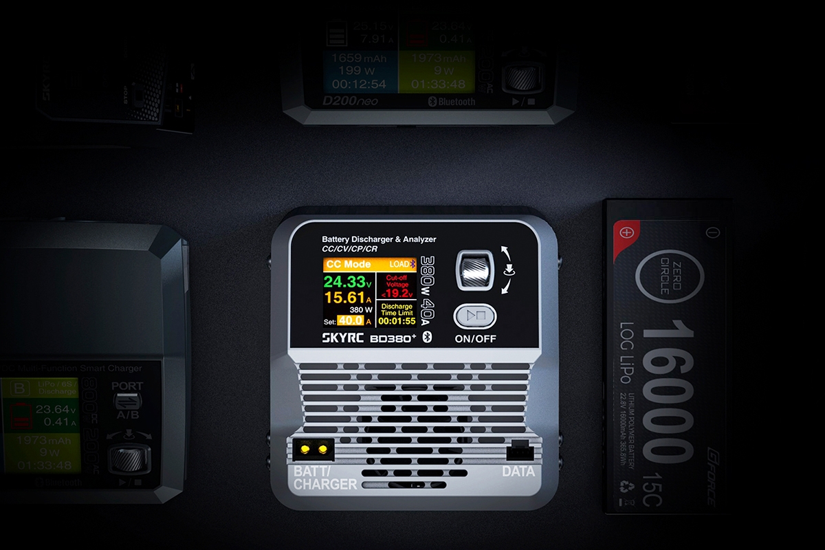 BD380+ je výkonný vybíječ (externí zátěž pro kompatibilní nabíječe SkyRC), který umožňuje vybíjet akumulátory proudem až 40 A (při max. výkonu 380 W), a měřit a porovnávat výkonnost akumulátorů. BD380+ umožňuje ve spolupráci s kompatibilním nabíječem SkyRC a PC programem Charge Master nebo mobilní aplikací přesné měření užitečné kapacity akumulátorů za plně kontrolovatelných a opakovatelných podmínek – při výběru nejlepšího akumulátoru pro vaši aplikaci už nebudete jen hádat, ale budete znát „tvrdá čísla“.
