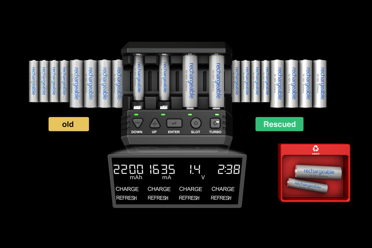 Čtyřkanálový nabíječ jednotlivých článků velikosti AA a AAA NiMH/NiCd proudem 0,2-2,0 A se síťovým napájením. Inteligentní provozní režimy nabíjení, rychlonabíjení, vybíjení, ořivování+analýz a formování poskytují komplexní péči o akumulátory. Přehledný LCD displej se zobrazením napětí, proudu, kapacity a času. Možnost bezdrátového ovládání v mobilní aplikaci (po připojení doplňkového Bluetooth modulu).