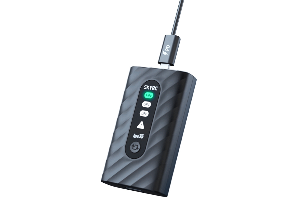 Nabíječ SKY RC Type35 s vestavěným balancerem je velmi jednoduchý „krabičkový" nabíječ pro rekreační jezdce a letce s napájením z USB-C zdroje s protokolem PD3.0 pro nabíjení 2-4S LiPo, LiHV a LiFe akumulátorů. Je ideálním doplňkem „setových" stavebnic umožňující jednoduché nabíjení doma nebo výborným společníkem na cesty, kdy s sebou nechcete "tahat" velký, těžký a drahý nabíječ. Nabíjený akumulátor se připojuje pomocí prostřednictvím servisního konektoru systému JST-XH.