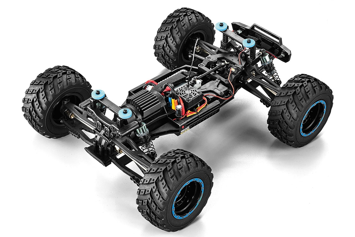 Model Monster trucku v měřítku 1:12 s pohonem všech kol 4x4, poháněný střídavým motorem 390 vč. RC volantové soupravy 2,4 GHz a pohonného akumulátoru. Voděodolná jednotka regulátoru/přijímače.