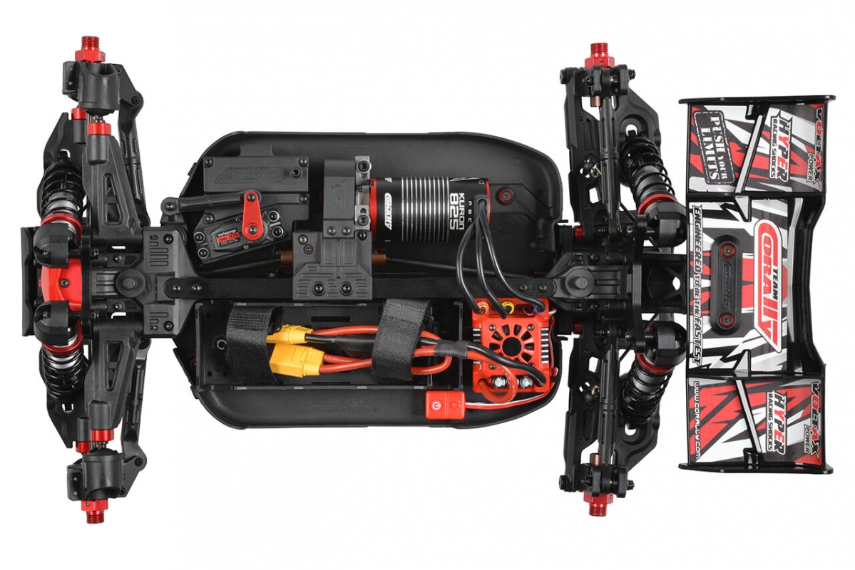 Dodávaný Regulátor Team Corally Torox 185A 4-6S je kromě dalších bezpečnostních a výkonnostních možností vybaven ochranou LiPo akumulátoru, zatímco 4pólový střídavý motor Team Corally Kuron 2050kV poskytuje působivou rychlost a točivý moment. Přesné ovládání řízení zajišťuje HV-7225 HV Servo s kovovými převody. Pohodlná 2,4GHz vysílačka CT2R poskytuje pevné rádiové spojení a nastavitelné funkce pro pohodlí při řízení.