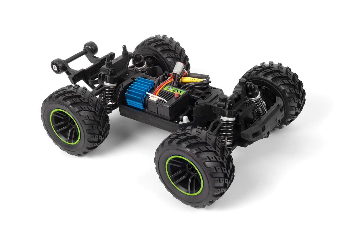 Model Monster trucku v měřítku 1:20 s nezávislým zavěšením a pohonem všech kol 4x4, poháněný střídavým motorem vč. RC 2,4GHz volantové soupravy s omezovačem rychlosti a pohonného akumulátoru.