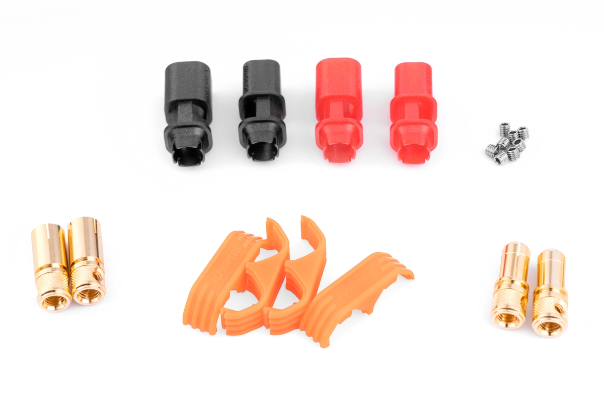 Zlacené 6mm konektory se společným domkem pro 8,4mm2 (8AWG) kabel. Konstantní proud 240A, špičkový 280A. Nepájecí varianta - kabel je zajištěn pomocí dvou imbusových červíků. Balení 2 páry (1 červený a 1 černý).