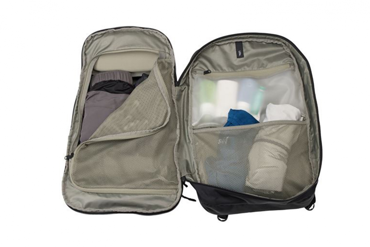 Batoh lze zcela rozepnout, takže je možné do něj vkládat věci z obou stran. Má přihrádku na objemné předměty se síťovaným panelem, který se zapíná na zip a udržuje věci utříděné.