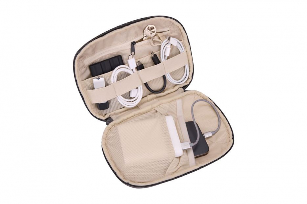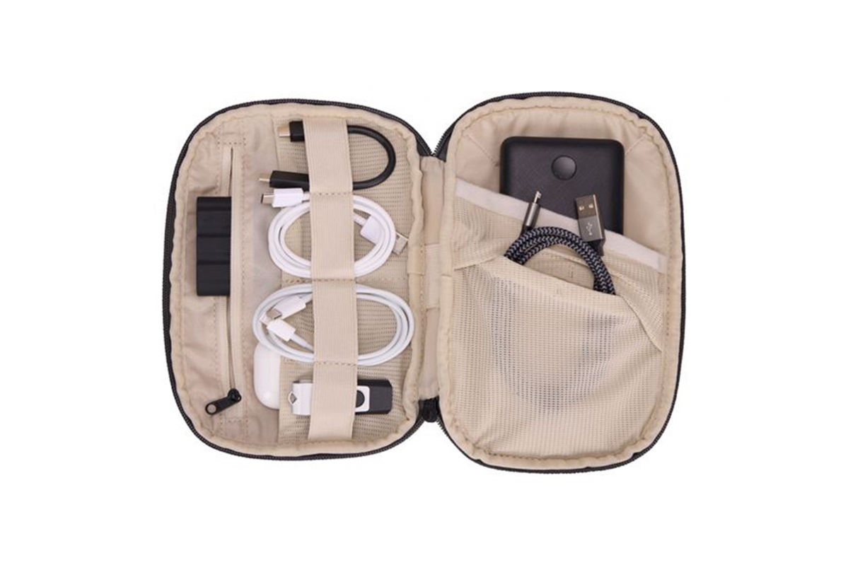 Pouzdro Thule Subterra Powershuttle Medium poskytuje promyšlený úložný prostor pro nabíječky, kabely, drobnou elektroniku, psací potřeby a další předměty.