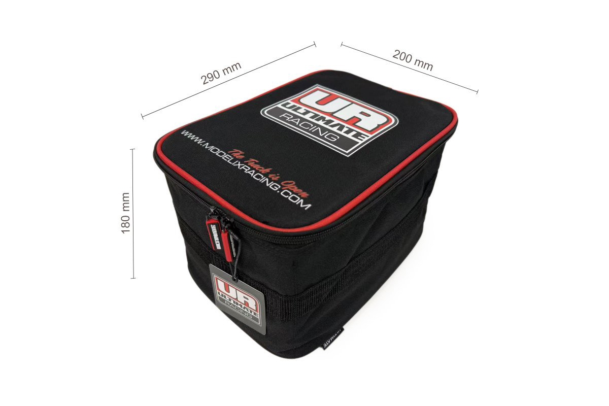 Hlavní vlastnosti tašky Ultimate: Zesílená konstrukce: Pevné stěny a víka vyrobené z pěny laminované na plastové desky, které nabízí pevnou strukturu a vnitřní ochranu. Kapsa ve víku: Vnitřní přihrádka na zip, ideální pro uložení návodů, kabelů nebo šňůrky k vysílači. Špičková kvalita: Odolné kovové zipy s gumovými táhly s logem Ultimate Racing. Snadná přeprava: Ergonomická horní rukojeť a odolný nylonový povrch. Vnější držák na karty: Ideální pro označení obsahu tašky. Kompatibilita: Ideální velikost pro uložení do velkých tašek na vybavení, jako je Ogio 9800.