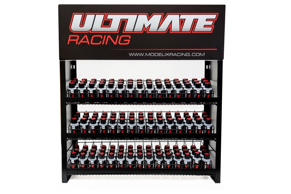 Hliníkový prodejní stojan na oleje značky Ultimate Racing. Vejde se do něj 5 x 75ml nebo 100ml lahviček od každé viskozity s celkovým počtem 45 viskozit.