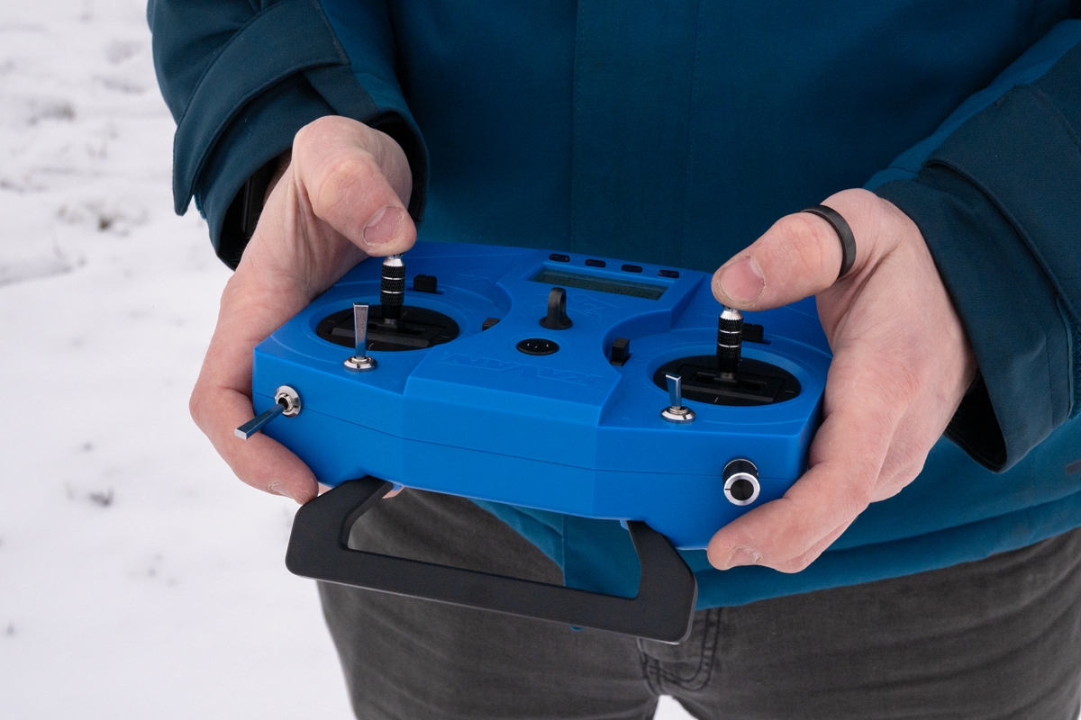 Tělo vysílače je robustní a dokonale padnoucí do ruky. Texturované gripy na bocích a zadní straně těla poskytují pevný pohodlný a jistý úchop se všemi ovladači na dosah. Samozřejmě nechybí ani možnost nastavení síly neutralizačních pružin a aretace k naladění módu a odezvy podle vlastních preferencí.