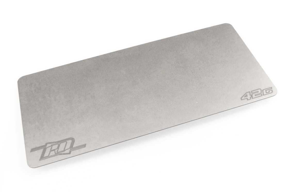 Revolution Design Wolframové závaží pod shorty akumulátor je přesně broušená 0,5 mm wolframová destička, která přidává 42 g závaží přímo pod jakýkoli 95mm shorty LiPo akumulátor. Protože wolfram má hustotu přibližně 19,3 g/cm³ - více než dvojnásobek hustoty mosazi (≈ 8,5 g/cm³) a oceli (≈ 7,8 g/cm³) - může být deska o tloušťce méně než poloviční oproti běžným 1-1,2 mm mosazným nebo ocelovým alternativám. Díky nižšímu profilu je baterie uložena zhruba o 0,7 mm hlouběji, čímž klesá těžiště vozu a umožňuje ostřejší zatáčení a stabilnější dopady na tratích s vysokou přilnavostí. Frézované hrany a matná povrchová úprava dodávají desce prémiový vzhled, zatímco surový wolfram odolává korozi bez dalších nátěrů.