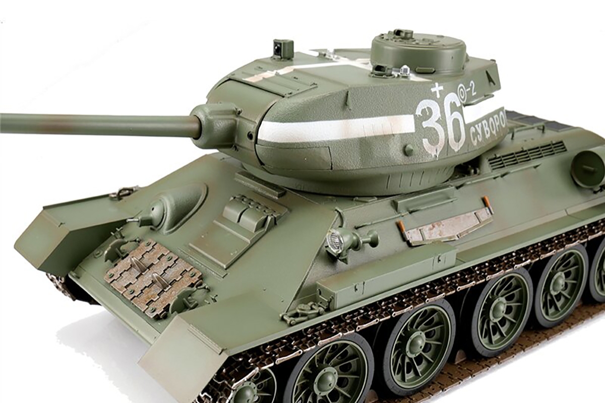 T34/85 byl použit až na jaře 1944. Byl vyzbrojen 85mm kanónem. Zničení tanku Tiger I na vzdálenost 1 km bylo bez obtíží možné. Celkem bylo postaveno kolem 20 000 kusů a Rusové označili T34/85 za „nejlepší tank 2. světové války“. Tento extrémně detailní R/C model z kovárny WSN-Trumpeter-Torro v měřítku 1:16 je k dispozici v zeleném letním maskovacím provedení. Model s jedinečným poměrem cena/výkon, který by neměl chybět v žádné kolekci.