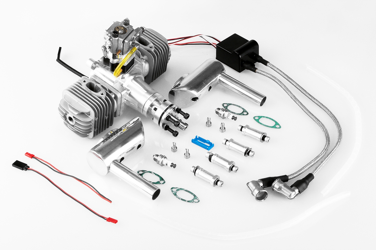 Součástí balení je: motor, elektronické zapalování + 2 svíčky, 2 tlumiče + těsnění výfuku, distanční sloupky a spojovací materiál.