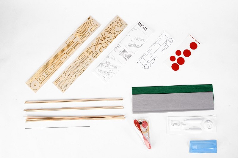 Stavebnice obsahuje: balsové laserem vyřezávané díly, balsové nosníky, vakuově lisované díly (kryt motoru, kryt kabiny...), plastovou vrtuli s hřídelí a hlavicí, gumový svazek (soutěžní guma FAI TAN II), kola, ocelovou strunu na podvozek a další drobné díly, barevný potahový papír, aršík samolepek, stavební plán.