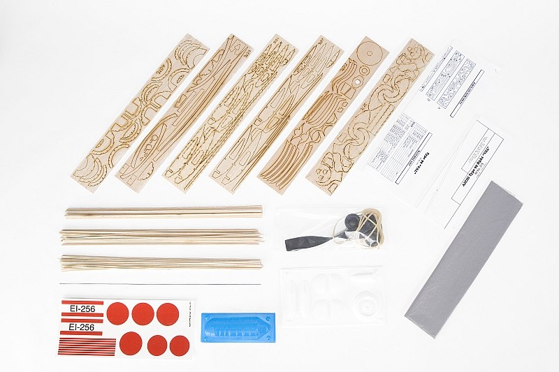 Stavebnice obsahuje: balsové laserem vyřezávané díly, balsové nosníky, vakuově lisované díly (kryt motoru, kryt kabiny...), plastovou vrtuli s hřídelí a hlavicí, gumový svazek (soutěžní guma FAI TAN II), kola, ocelovou strunu na podvozek a další drobné díly, barevný potahový papír, aršík samolepek, stavební plán.