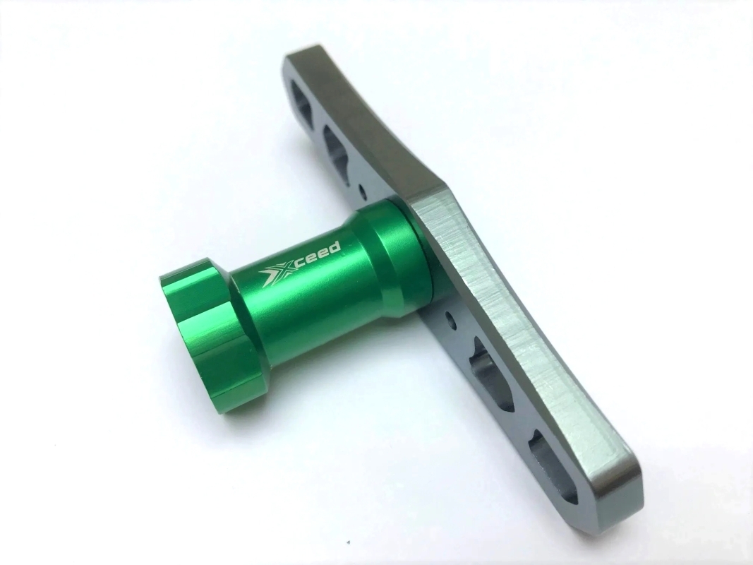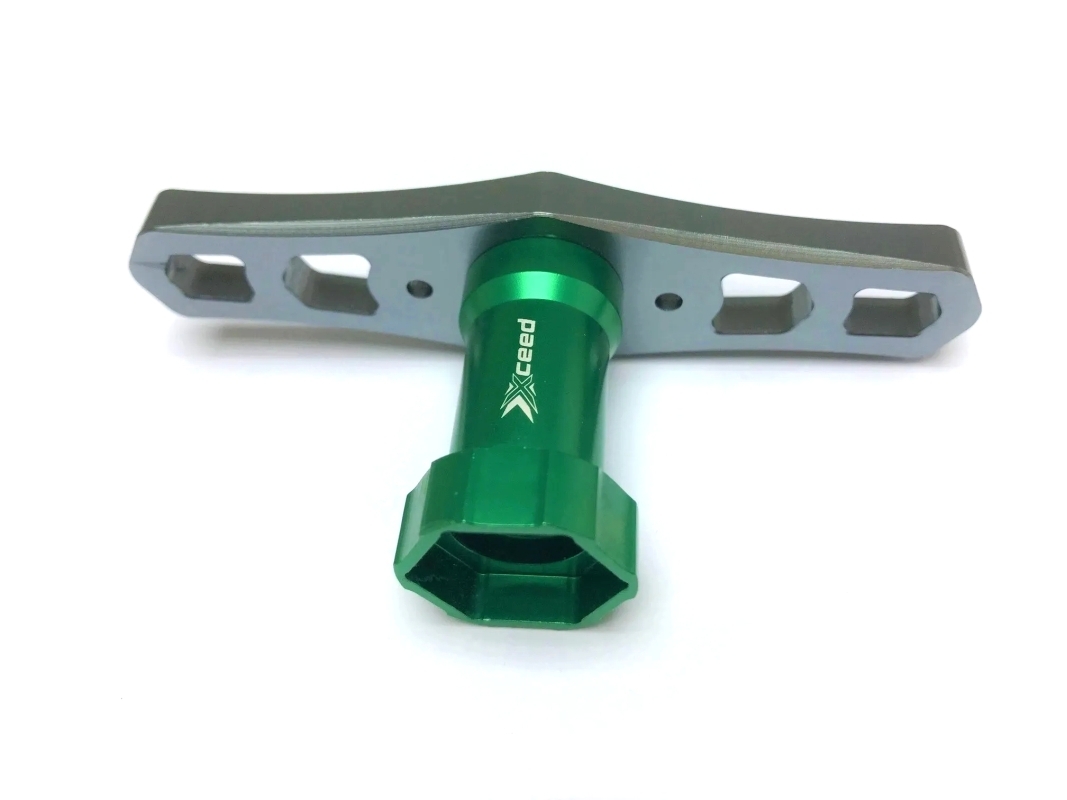 Xceed představuje náš nový T-klíč na matice kol V2 17 mm pro Buggy, Truggy, Monster a GT v měřítku 1/8. Lehký klíč je vyroben z hliníku a má šedo/zelenou povrchovou úpravu. Umožňuje snadné utahování a odšroubování 17 mm matic kol, a to i u silně zaseknutých ozubených matic kol. Loga XCEED doplňují vizuální vzhled.
