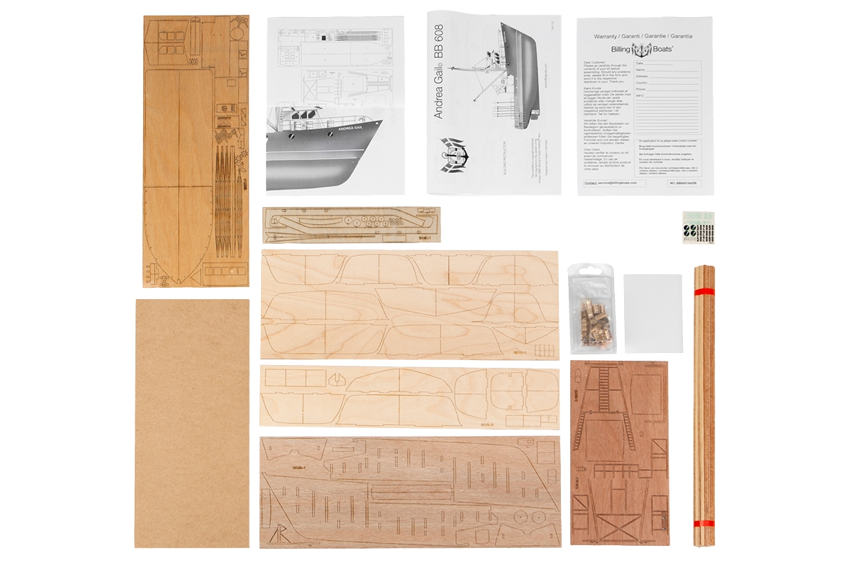 Andrea Gail má trup klasické dřevěné konstrukce z laserem vyřezávaných dílů s plaňkovanou obšívkou doplněnou balsovými bloky, dřevěnou palubu a nástavbu. Stavebnice obsahuje všechny dřevěné a plastové díly potřebné pro dokončení modelu, maketové příslušenství (např. poziční světla, kotvu, lodní šroub atd.).