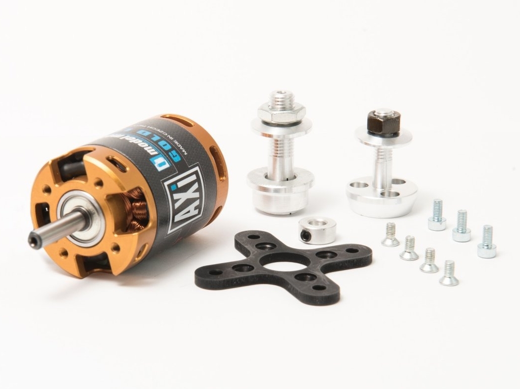 Sada motoru obsahuje: střídavý motor AXI 2826/6 V2 s kabely, kleštinový unašeč pro pevnou vrtuli, sadu pro zadní montáž, návod.