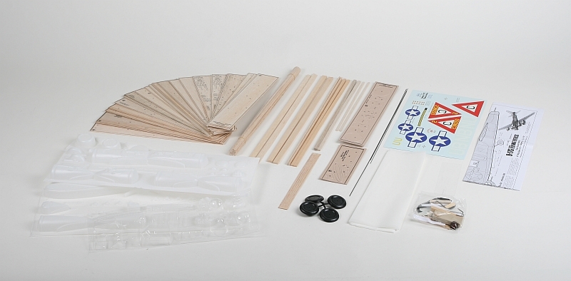 Stavebnice obsahuje: balsové předseknuté díly, balsové nosníky, předseknuté díly z plastikové překližky, vakuově lisované maketové díly (kryt motorů, motory, příď trupu...), plastová kola, ocelovou strunu na podvozek a další drobné díly, potahový papír, aršík mokrých obtisků, stavební plán.