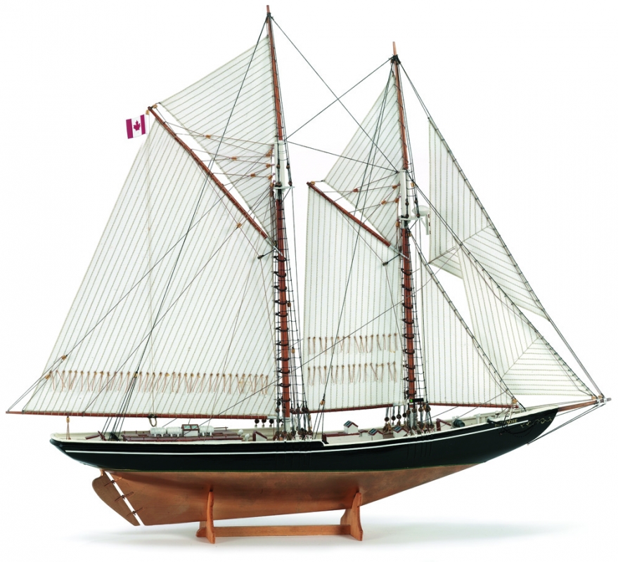 Dvoustěžňový škuner Bluenose byl spuštěn na vodu v Lunenburgu v kanadském státě Nové Skotsko (Nova Scotia) 26. března 1921 a původně byl určen pro rybolov v drsných vodách při pobřeží Newfoundlandu. Velmi brzy se ale ukázalo, že se podařilo vytvořit neuvěřitelně rychlou loď, která začala pod velením kapitána Anguse Walterse sbírat vítězství ve všech regatách podél východního pobřeží USA a Kanady. Představte si to – obyčejná rybářská loď se stala nejrychlejší jachtou! Její sláva se šířila, dostala se na mince i poštovní známky, ve znaku ji měla 434. eskadra Kanadského královského letectva a její siluetu najdete na poznávacích značkách aut v Novém Skotsku! Kariéra Bluenose skončila roku 1946 po ztroskotání u břehů Haiti, ale loď nebyla zapomenuta. V roce 1964 byla na vodu spuštěna její přesná replika Bluenose II, která brázdila vody až do roku 2010 – a poté byla nahrazena nově postavenou lodí stejného jména spuštěnou na vodu roku 2013. Bluenose II se z úcty k původnímu plavidlu neúčastní žádných soutěží, ale je ozdobou všech regat, na které zavítá a slouží jako oficiální „velvyslanec“ Nového Skotska. Škuner Bluenose II je určen pro mírně pokročilé lodní stavitele; je konstruován jako neplovoucí stolní maketa.