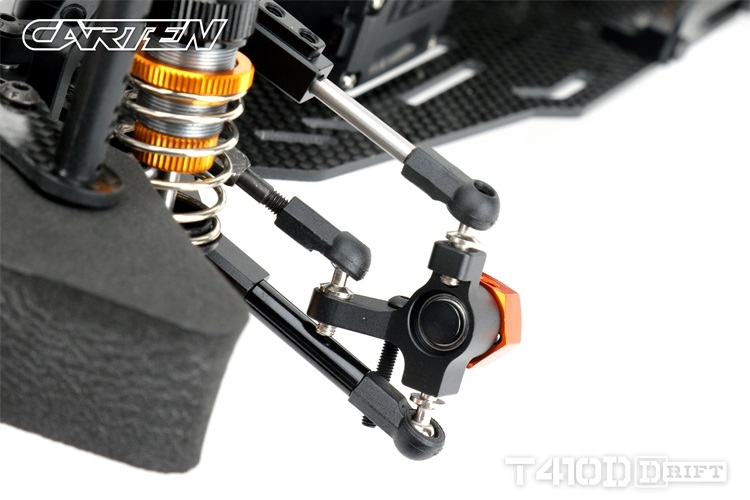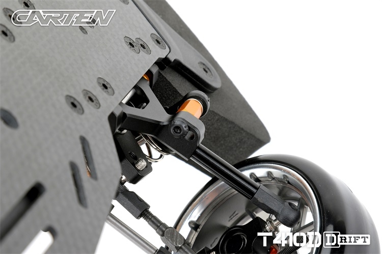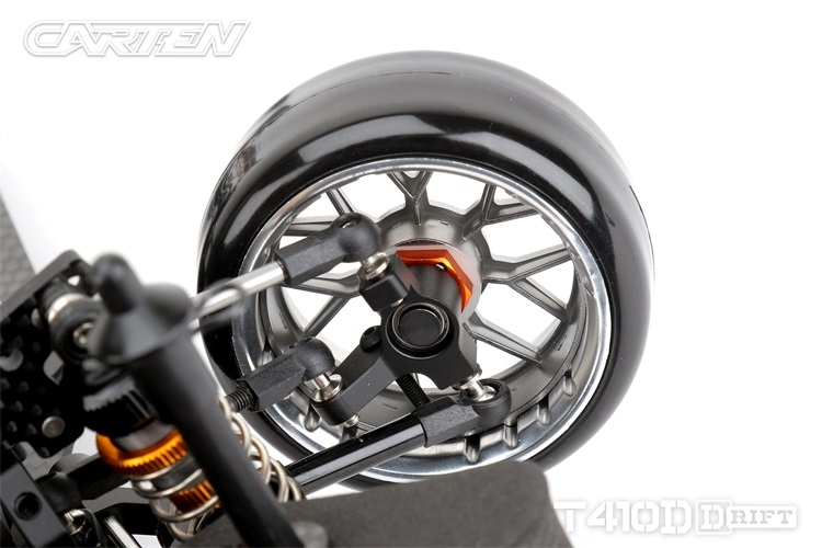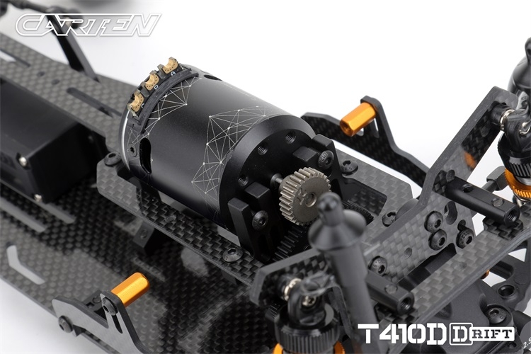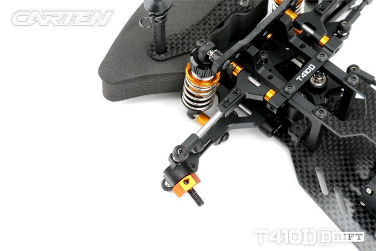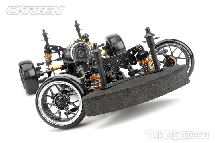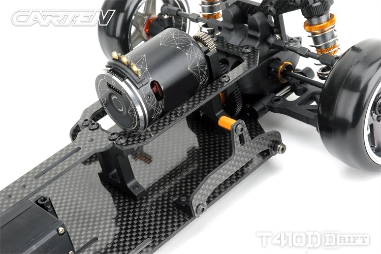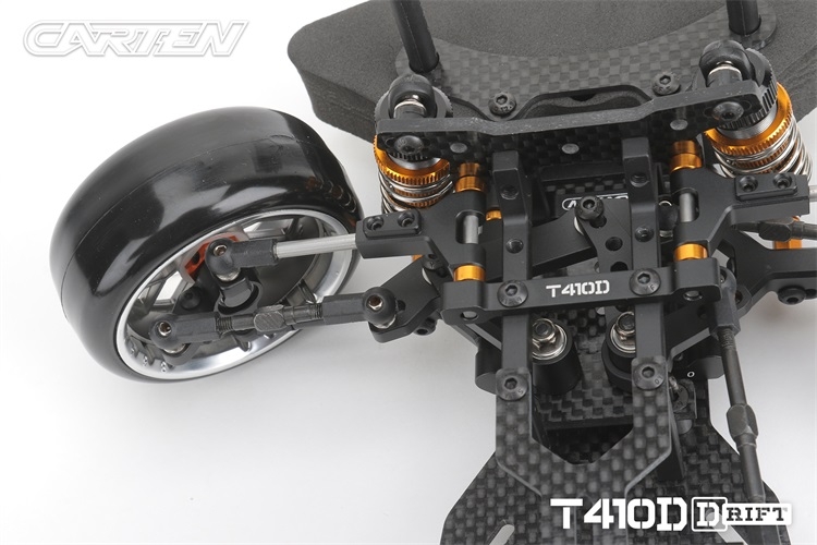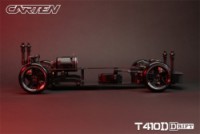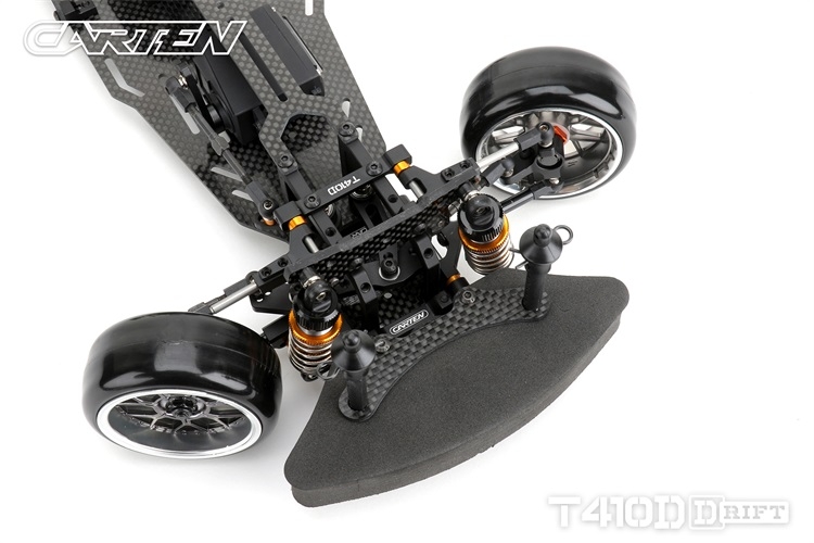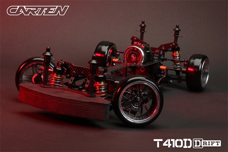 Stavebnice podvozku pro rekreační i soutěžní 1/10 RC drift. Carten T410D přináší kvalitní komponenty z karbonu a hliníku. Moderní layout zahrnuje podélné horní uložení motoru a držák akumulátoru v blízkosti zadní nápravy. Výsledkem je optimální těžiště a zatížení zadní nápravy optimální i pro závodní použití. Požadavkům náročných řidičů vyhoví i vysoký maximální úhel řízení a široké možnosti nastavení geometrie.