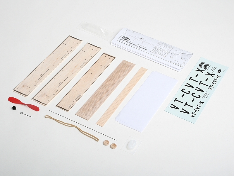 Stavebnice obsahuje: balsové předseknuté díly, balsové nosníky, vakuově lisované díly (kryt motoru, kryt kabiny), plastovou vrtuli s hřídelí a hlavicí, gumový svazek, vysoustružená balsová kola, ocelovou strunu na podvozek a další drobné díly, potahový papír, aršík mokrých obtisků, stavební plán.